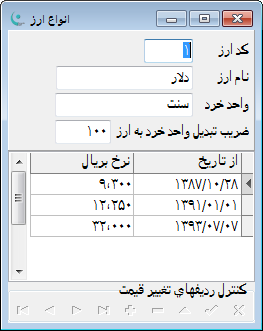 برای استفاده از روش مذکور ابتدا بایستی در منوی {تعاریف.تعاریف پایه.انواع ارز} ارزهای مورد نظر (دلار، یورو، ..) تعریف شده و در پنجره مذکور برای هر بازه زمانی نرخ ریالی ارز تعریف شده باشد: